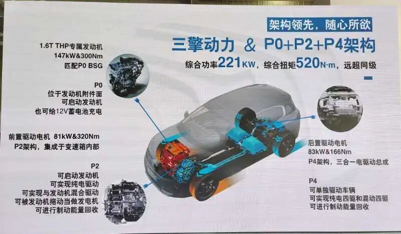 之前我们说过,售价145万元的Polestar 1(参数|询价)拥有当前最高等级的插电式混合动力架构,但是这次天逸PHEV也不遑多让,甚至架构复杂程度更胜一筹——Polestar 1是2.0T+8AT+P1电机+P4双电机,而天逸PHEV则是1.6THP+8AT+P0电机+P2电机+P4电机,从而形成了“三擎四驱”的架构。