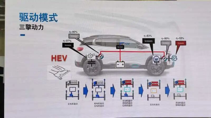 举个或许不太恰当的例子,比如三四十到五六十公里,全靠发动机有一点不经济,因为发动机转速和负载不停变,但是电量又不能纯电驱动,所以如果这时候发动机处于一个折中的状态发点电,然后P4电机能弥补加减速的动力,这样就比纯发动机驱动要节能。只是这个节省的能耗没有想象那么多,但是成本要比大众GTE车型单纯P2高不少,只能说雪铁龙或许是考虑到既然已经是高成本了,不如就一步到位,做到兼顾高性能——三个动力输出源共同输出,实际上内部测试0-100km/h加速可以跑到6秒多一些。
