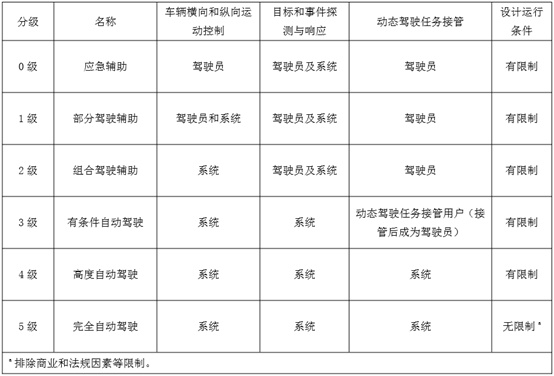 在整体分级思路上,《汽车自动驾驶分级》(报批稿)和SAE标准都是以人类驾驶员/自动驾驶系统在车辆行驶中充当的角色,汽车有无行驶限制条件,以及当汽车出现故障时“谁”来负责接管为基础,从而对汽车的自动驾驶等级进行定义的。
