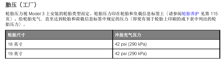 (图:特斯拉 Model 3说明书中关于标准胎压的介绍)