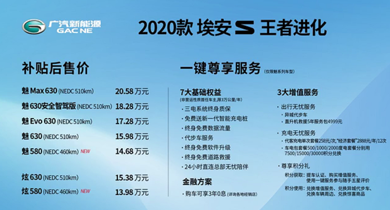 而诸多优势也让埃安S成为了新能源电动汽车市场上炙手可热的爆款车型。从上市三个月破万,到如今国内纯电动汽车销量排行榜仅次于特斯拉Model 3中国品牌车型。市场的认可,消费者的拥护,埃安S用实力证明了其“中高级纯电轿车引领者”的身份,也为进一步打开中国新能源车市场做出了重要贡献。三维进化 王者归来如今,2020款埃安S的到来,不仅为用户带来续航、科技、服务“三大进化”,其补贴后13.98万—20.58万元售价,也做到了加量不加价。2020款埃安S在取消魅Max 530及魅Evo 530两款车型的基础上,推出全新NEDC续航达460km的魅580和炫580系列车型,且快充充满80%只需30分钟,解决纯电出行的最大“痛点”,进一步满足了新能源汽车用户的出行需求。