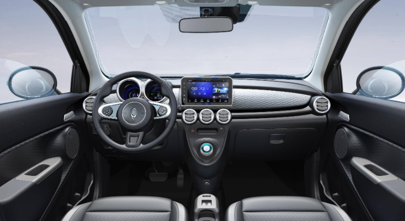 内饰方面,新车多用圆形元素,大走可爱风,三辐式方向盘呈U形断开式设计,搭配双圆仪表造型以及支持手机互联的9英寸悬浮式大尺寸中控液晶屏,整体视觉感受十分简洁,比较复古。