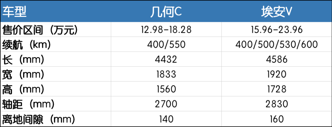 日前,吉利几何C(参数|询价)正式上市,共推出400km和550km两种续航版本,共5款车型,补贴后售价区间为12.98万-18.28万元。新造车势力先晾在一边,中国品牌纯电动紧凑型SUV能拿得出手的也就近期上市的广汽新能源埃安V(参数|询价)。究竟,几何C和埃安V,谁更能打动年轻消费者的心。