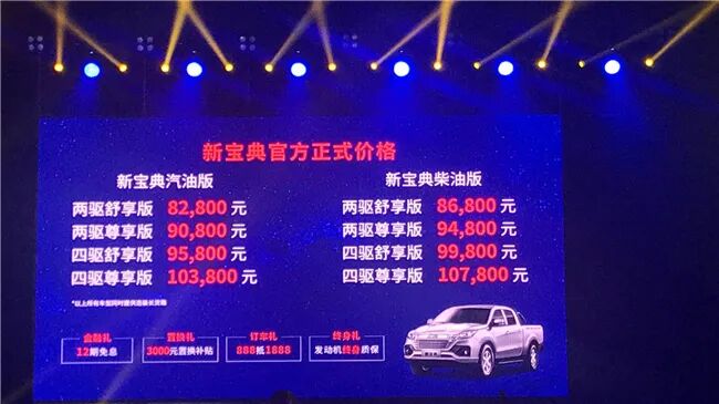 在消费升级以及全国“皮卡进城”政策的春风下,为了更加顺应消费者需求,江铃重磅推出全新设计的新宝典。8月25日,江铃皮卡新宝典正式上市,新车提供2.5T柴油和1.8T汽油两款动力共计8款车型,并且有标轴/长轴两款货斗长度和后驱/四驱两款驱动形式可选,售价区间为8.28万-10.78万元。同时,为了回馈广大用户,新车还推出了888元抵1888元购车礼、3000元补贴置换礼、十二期免息金融礼以及发动机终身质保等优惠好礼。