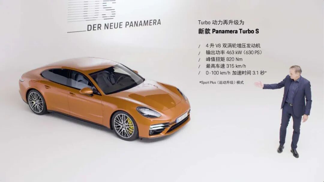 不过值得留意的是,新款Panamera不提供Turbo车型,直接带来Turbo S。此动力版本也是搭载了4.0T发动机,最大功率达到了630匹马力,在“Sport Plus”(运动升级)模式中,零百加速时间只要3.1秒。