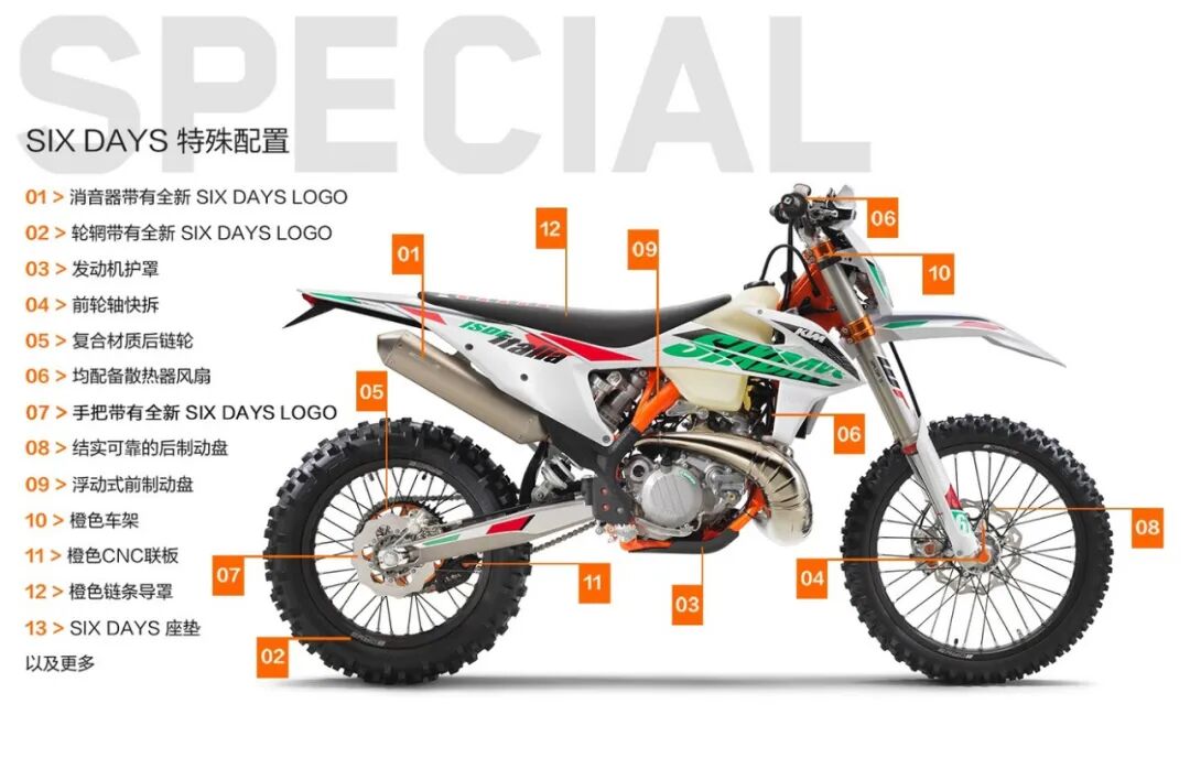 EXC TPI SIX DAYS是目前KTM最为畅销的车型之一,全新的TPI技术也避免了传统化油器的弊端,300毫升二冲程发动机也足以提供充足的功率和扭矩,轻巧的车身也让它十分矫健、易操作。而EXC-F SIX DAYS所提供的动力则可以与450毫升发动机媲美,在充沛的动力与灵活的操纵之间达到了完美平衡。可以说,这两款新车所能提供的乐趣和性能,目前还没有能与之匹敌的竞品车型。两款车型首批仅限量50辆,也势必成为“秒订”车型。