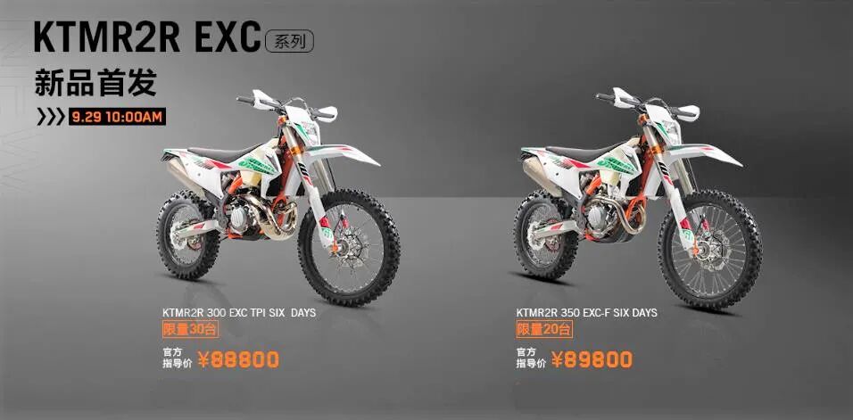 尽管车展上少得可怜的摩托车展品让车迷有些失望,但这不意味着9月下旬的摩托车市场没有亮点。9月28日,KTM发布了旗下两款越野车产品--KTM 300 EXC TPI SIXDAYS、KTM 350 EXC-F SIX DAYS,售价分别为8.88万元与8.98万元。这是KTM首次官方引进越野车,标志着喜爱越野的骑士们又可以有两个合法又好玩的越野摩托车可选了。