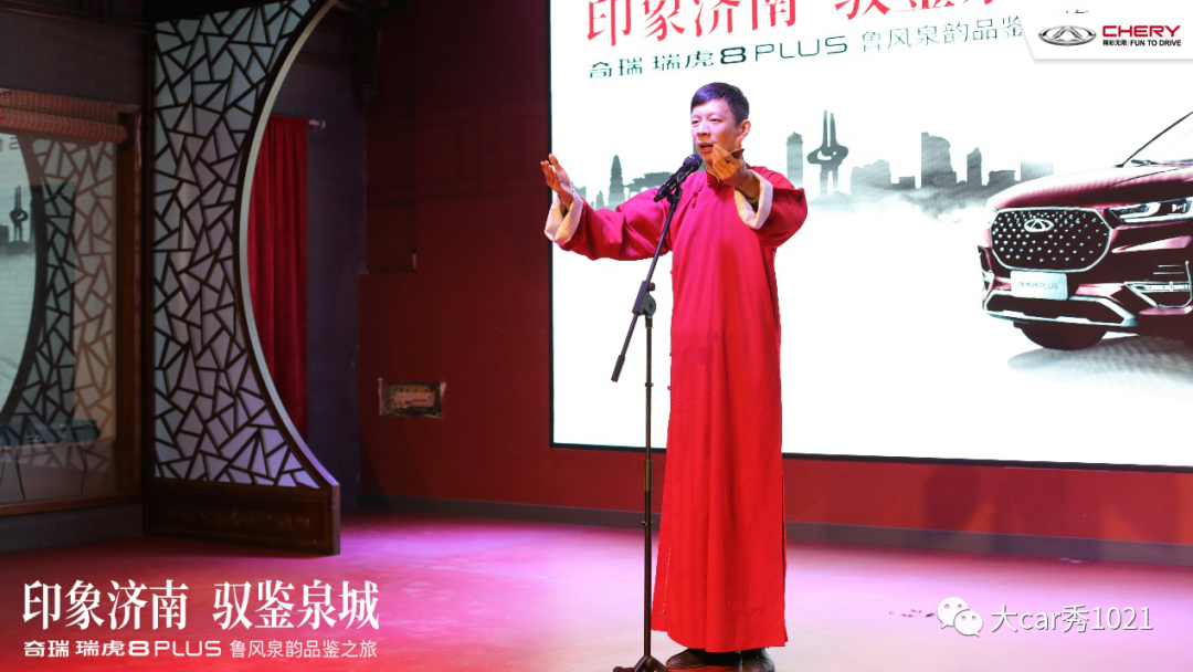 鲁风泉韵,鉴赏中式奢华 泉城济南,泉韵悠然。有人说,济南是一座来了就不想走的城市,每一处都值得深入了解。细细思量,好像的确如此,像记载着城南往事的曲水亭,汇集四方吃货的芙蓉街,街头巷尾转角处的茶水灶,令人拍手叫好的山东快书,以及金柳倒映的护城河和波光粼粼的护城河……数不胜数,生活在这样一座泉韵文化浓厚的城市,每天都有机会体验新中式奢华的品质生活。 打卡拍照,赋能新风尚 此次鲁风泉韵品鉴之旅,瑞虎8 PLUS作为“明星模特”,不仅带领大家领略了众多拍照打卡的好地方,像大明湖、宽厚里、百花洲、老济南古城、贡院墙根……等等,而且还和古装美女合照,贡献出了不少美照,拍摄现场更是引来众多行人驻足,靓丽新奢的外观吸引了一大波粉丝,妥妥的新风尚引领者! 品质生活,更需品质出行 被泉城文化所浸润的泉城生活,其生活方式与生活品质更独具特色与魅力,富有新中式的奢华感。正如此次品鉴之旅的主角——号称“豪华陆地飞行舱的瑞虎8PLUS”,不仅汇聚奇瑞顶级技术,还融合东方美学,致力于以豪华、科技之美成就品质出行。大气,是沉淀后的底蕴;内敛,是历经后的稳重。相信此次瑞虎8PLUS的重磅推出,将会以绝对的从容之姿,领航品质出行的全新征程。 老舍茶馆,鉴赏传统文化 此次奇瑞山东大区特别选择坐落在高新区汉峪金谷的老舍茶馆作为品鉴地点,并邀请山东主流媒体和奇瑞车主,一同参与到这次充满鲁风泉韵的品鉴之旅当中! 泉水烹茶,茶肆滋味长。虽然说济南不产茶,但却有的是绿如翡翠、浓似琼浆的泉水。而甘泉与香茗的组合,在舌尖碰撞的滋味不言而喻。在老舍茶馆内,不仅可以跟随茶道大师左振声老师了解中国传统茶道文化及交流茶道品鉴心得,还可以一品香茗。 除此以外,品鉴会上,更是邀请了山东快书表演艺术家姜超先生为在场的嘉宾带来精彩的山东快书段子集锦。