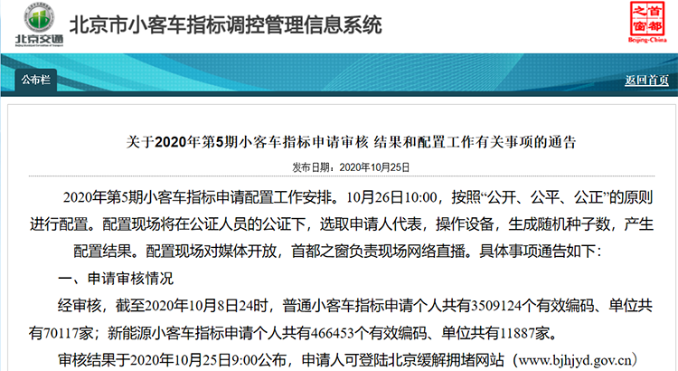 信息显示,经审核,截至2020年10月8日24时,普通小客车指标申请个人共有3509124个有效编码、单位共有70117家;新能源小客车指标申请个人共有466453个有效编码、单位共有11887家。