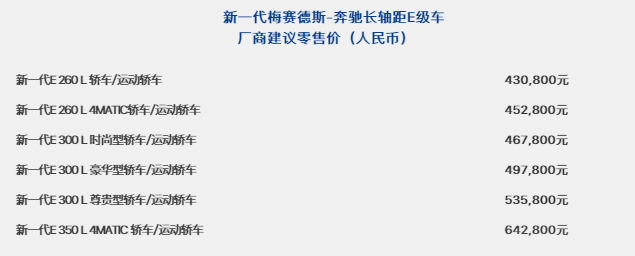 曾经的奔驰E是这样走过的:月销突破2万辆、中大型豪华轿车年度销量冠军、全球共交付超过1400万辆。头戴无数桂冠的新E此次上市提供轿车和运动轿车两种车型,共有E 260 L、E 260 L 4MATIC、E 300 L时尚型、E 300 L豪华型、E 300 L 尊贵型和 E 350 L 4MATIC 等型号可供消费者选择,价格43.08万元起。