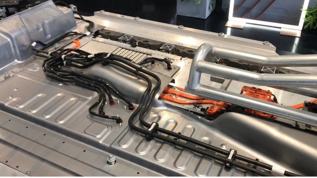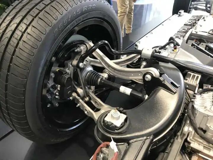EQC的底盘有85%是全新开发的,有15%是与GLC燃油车共用设计和零部件,与GLC共用白车身。从照片来看,底盘的布置结构对SUV车型来说没有什么特别不妥,车头的部位有一个笼状的结构,把前电机和一些大型的电器设备“框在其中”。