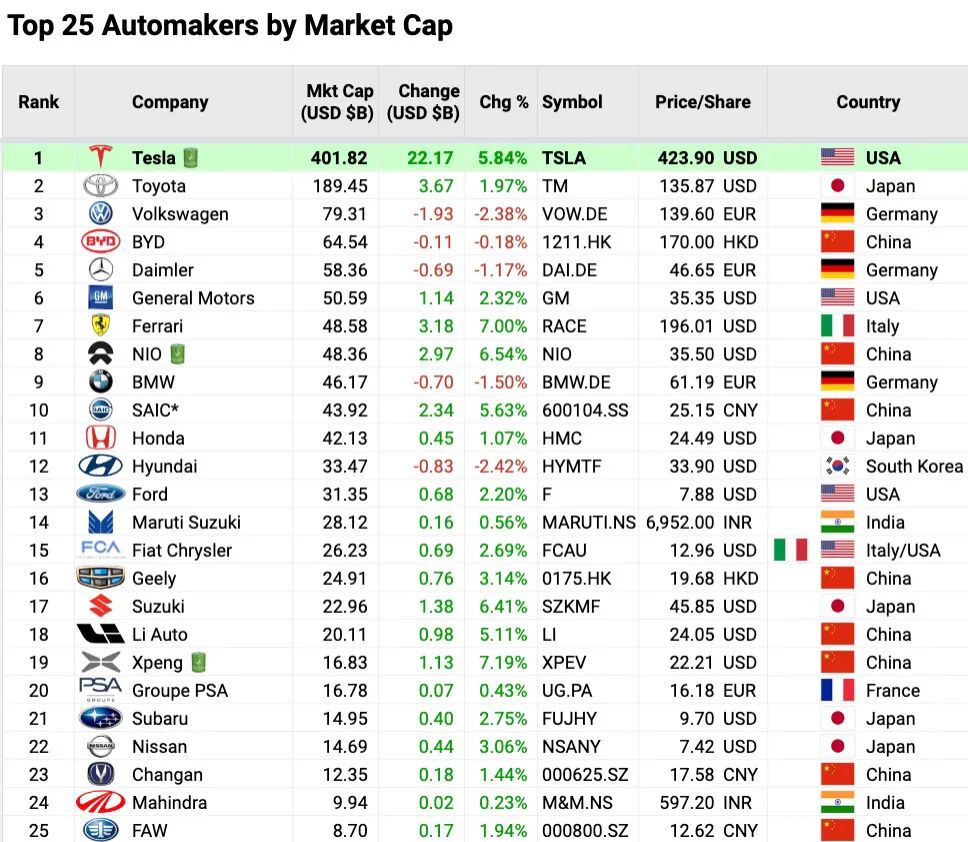 全球汽车公司市值榜:蔚来第8、理想18、小鹏19