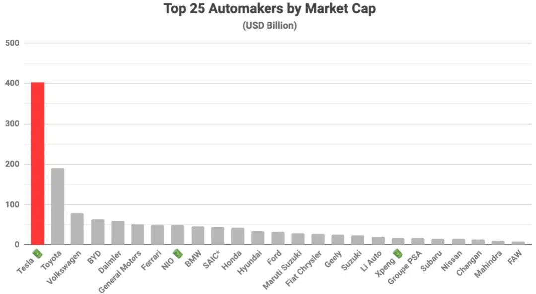 从这个市值柱状图看,特斯拉和丰田汽车相比其他公司,可谓是鹤立鸡群,无比突出。换个角度理解,那就是蔚来汽车距离前几名的市值则是相差无几,再涨两次说不准就能杀入前三了。要相信一切皆有可能!
