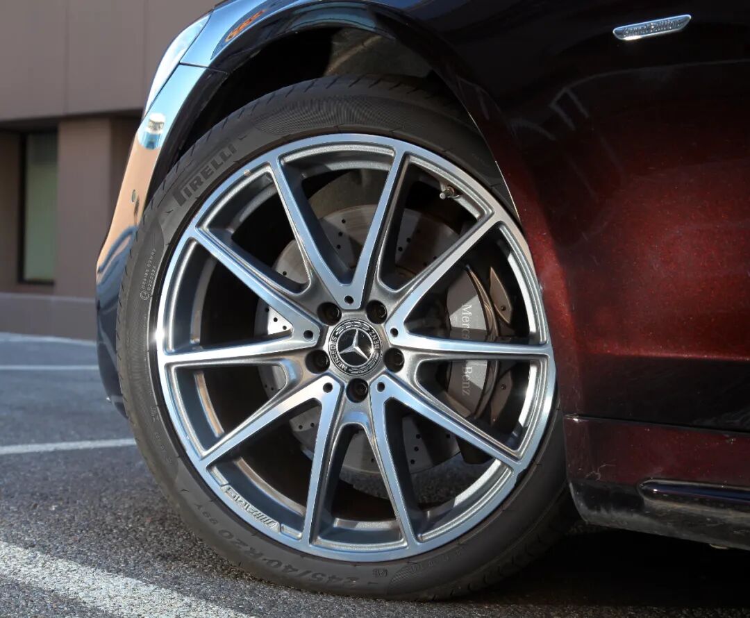 车侧的线条大气、流畅,完全符合人们对于一辆行政级豪华轿车的预期。由倍耐力提供的前245/45 R20、后275/35 R20轮胎有着不俗的抓地力和静音表现,再配上经典的十辐AMG轮毂,运动而不失稳重。