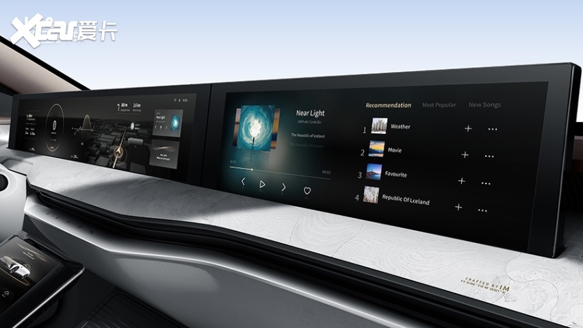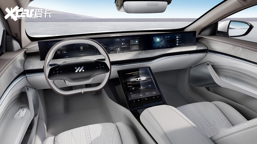 贯穿整个中控台的39英寸大屏可以根据使用场景分屏升降,同时新车还提供了一款12.8英寸AMoleD曲面屏。这三款大屏配备了智己汽车的“上善若水IMOS”智能操作系统,能够实现三屏交互,并支持“智能声控+屏幕触控”的操作方式。方向盘为两幅式的设计,换挡机构为怀挡的设定。12.8英寸曲面屏的下方为储物格,后方为无线充电面板以及可伸缩的杯架。