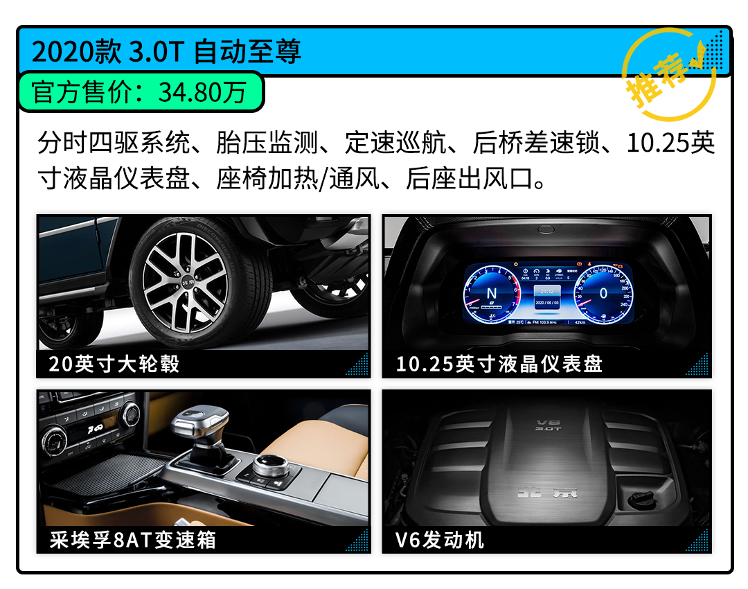 虽然在动力数据上并不算太出色,但胜在带大梁的底盘结构搭配上分时四驱系统以及后桥差速锁,足以确保在一般的烂路上安全脱困。在科技配置方面,配备了10.25英寸的液晶仪表盘以及8英寸的中控触摸液晶屏幕,能够实时反馈行车信息给驾驶员;同时前排座椅也配备了座椅加热/通风,确保在越野是保证良好的乘车舒适性。