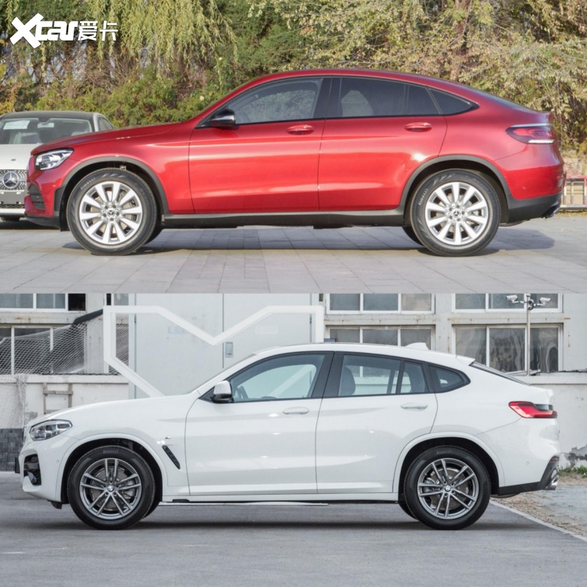 不管车头车尾造型如何,大家最关心的还是溜背曲线的设计。先看两位竞争对手的设计,奔驰GLC轿跑SUV将溜背曲线压得极低,配合19寸的大轮毂确实运动范儿满满,但严重损害了后排乘客的乘坐感受,宛如真的坐在一辆双门四座轿跑的后排:“上顶头、下卡膝、中间得缩着”。作为对比,宝马X4(参数|询价)将曲线留高,保障了足够的后排空间,但缺点是车尾过高显得异常臃肿,狭小的后窗也使车内后视镜仿佛成了多余的配件。
