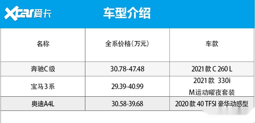 这三款车型价格较为接近,奔驰C级 2021款 C260L价格为34.68万元;宝马3系 2021款 330i M运动耀夜套装价格为37.99万元;奥迪A4L 2020款 40 TFSI 豪华动感型价格为34.38万元。