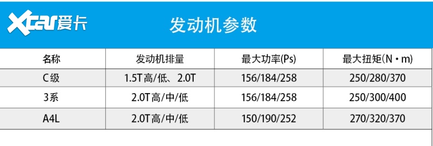 从账面数据看,C级1.5T高、低功率分别对应了3系2.0T的低、中版本,而2.0T发动机最大扭矩比3系2.0T高功率版本低30N·m。A4L2.0T中功率版本性能最好。传动系统方面,C级采用自家研发的9速手自一体变速箱,3系采用8速手自一体变速箱,A4L为7速双离合变速箱。