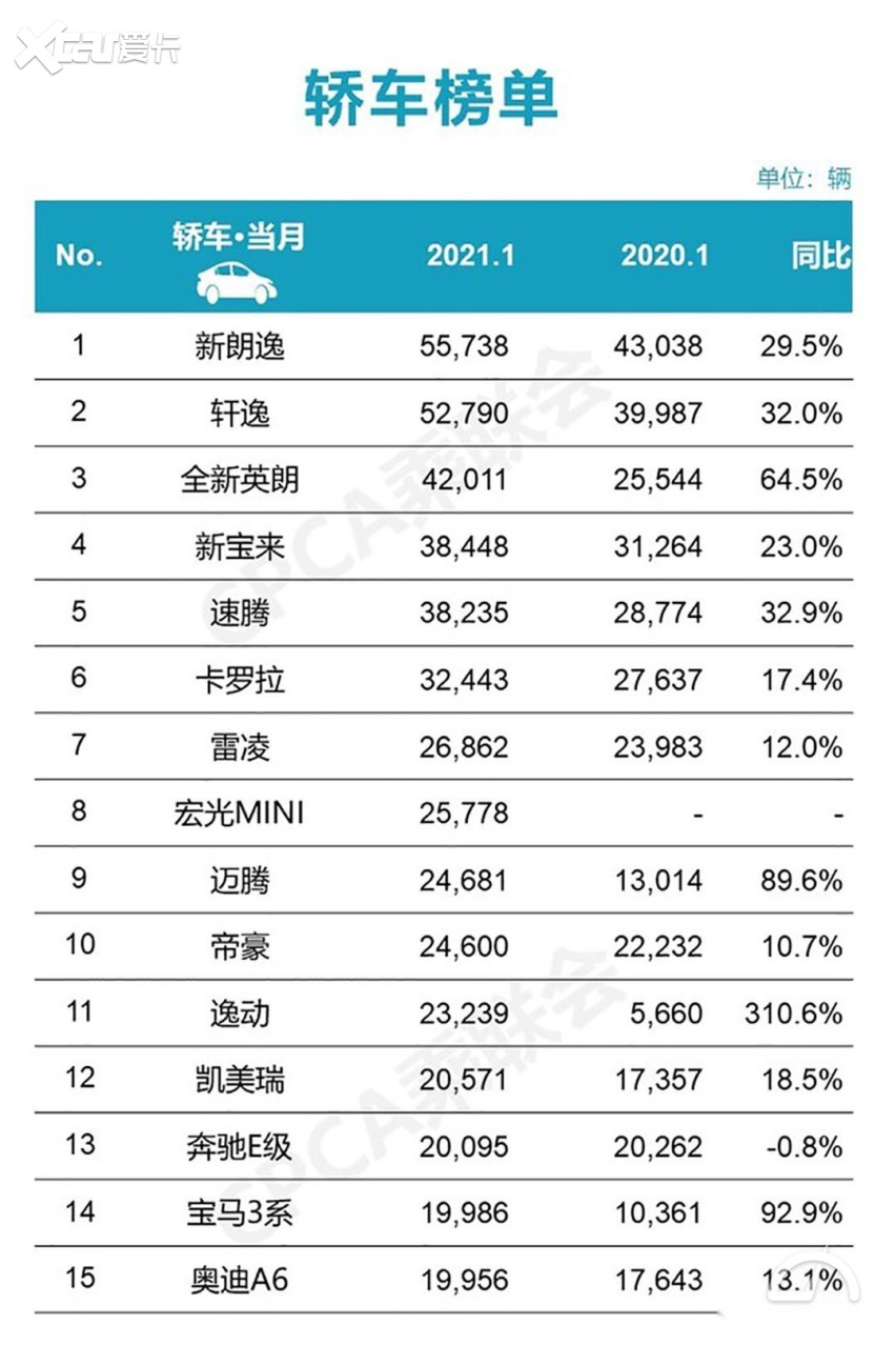 1月轿车销量出炉 朗逸月销超5.5万稳坐首榜两款国产车进前十