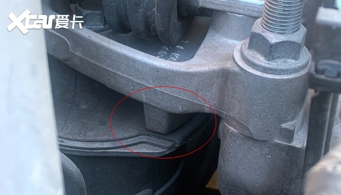 右前机脚胶是八代思域的常用“耗损件”,由于设计及材料的因素,导致了所有八代思域在行驶4万公里(或者两年左右)后,右前机脚胶就会耗损完毕,像红圈中的金属限位器直接硬碰硬地与橡胶底座碰撞。