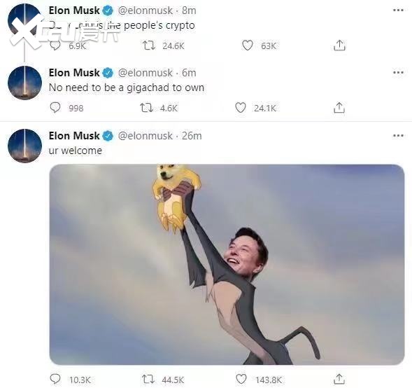 马斯克的影响力,甚至蔓延到了被普遍认为是恶搞的“空气币的鼻祖”狗狗币(Dogecoin)上。2月4日,马斯克在推特上发声,称“我们不需要成为亿万富翁就能拥有狗狗币。”狗狗币随即开启暴涨模式,一度登上各大交易所涨幅榜榜首,盘中最高涨幅达1000%。