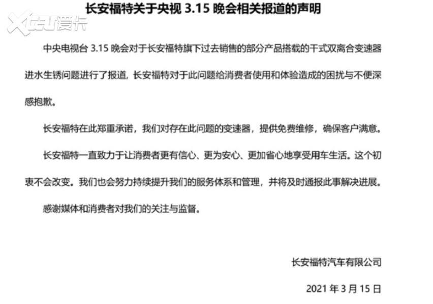 而在被3.15晚会点名后,长安福特官方微博紧急回应了此事,发布了致歉声明,声明图我放下方了,大家自行观看,总体的意思其实就是对于干式双离合变速箱进水生锈的问题,对消费者使用和体验造成的困扰深感抱歉;并将提供免费维修,确保客户满意。