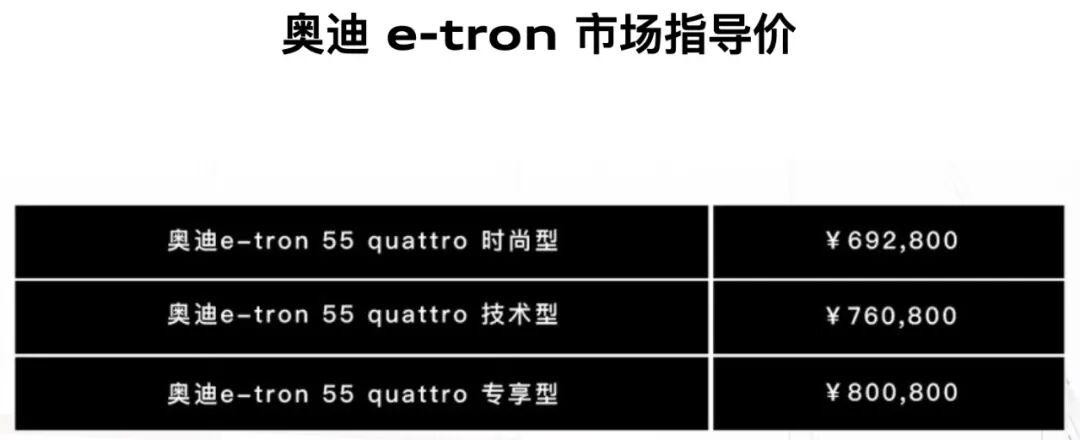 据奥迪中文官网显示,目前奥迪e-tron在国内销售的车型有3款,起售价692800元。入门款时尚型的主要数据如下:NEDC续航里程470公里、百公里加速5.7秒、最高速度200公里/小时,充电速度是40分钟充满80%。