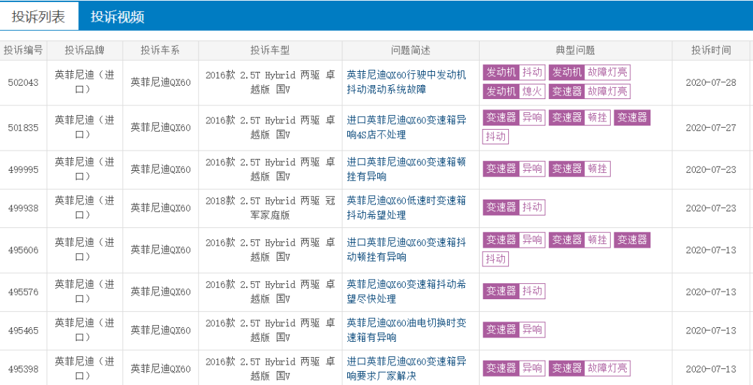 另外,从车主们的投诉来看,英菲尼迪QX60的CVT变速箱故障主要有以下几种表现: