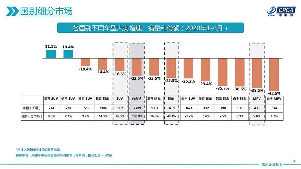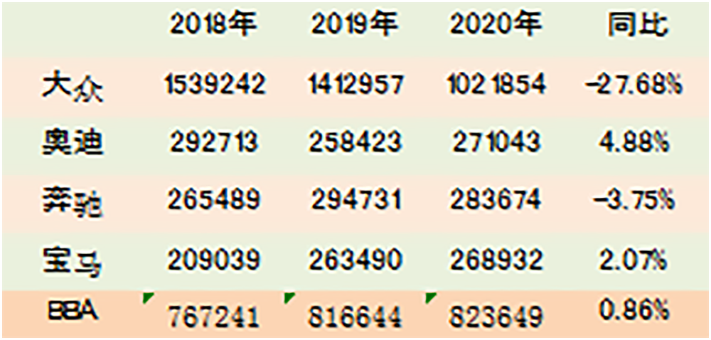 据乘联会数据,6月份只有德系和日系车实现了较为明显的同比增长。从半年的情况来看,虽然大家都在下降,但德系和日系的降幅明显小些——实际上,两者加起来已经占了国内乘用车市场的半壁江山,其中德系领先,销量超过206万辆。仔细研究数据,笔者注意到,德系车的繁荣,其实是靠着BBA在撑门面,像大众这样的巨无霸,上半年销量实则已经开始连跌,今年上半年更是拖累大盘乃至整个德系车的“元凶”!不信?我们先看乘联会数据,上半年BBA三大豪华品牌合计销量82.4万辆,同比增0.86%,同期大众品牌销量为102.2万辆,同比跌27.68%。参照乘用车市场上半年22.5%的降幅,大众品牌的确扮演着那个拖动大盘下行的“绝对主力”角色。▲德系品牌近几年上半年销量,数据来源:乘联会从厂商的角度看,南北大众依然是行业巨头,市场份额达到国内乘用车市场的五分之一。但下滑也显而易见,上汽大众下跌25.3%,一汽大众如若去除掉奥迪的数据,跌幅也是相当难看——看来,“碰撞门”加上疫情,对大众的影响还是相当明显的。而BBA阵营整体上销量与去年同期保持平稳,无论奔驰、宝马还是奥迪,已经可以用“默契”来形容,销量彼此之间十分接近。综合来看,德系销量虽然坚挺,但大众的表现并不好,某种程度上拖累了德系的表现。下面从车型的角度,来看下德系品牌的表现。无论轿车还是SUV:BBA才是真硬核在高端市场上,BBA的统治地位早已形成,并且优势越发明显。上半年奥迪A6的表现堪称惊艳,因为不仅位列C级车头名,增幅更是创下61.2%。而且,正是得益于A6L的强势,才弥补了A4L下滑造成的缺口,此消彼长,加之Q5L超过两位数的增幅,确保了奥迪品牌的同比增长,以及一汽大众整体数据跑赢大盘。在奔驰阵营,GLC、E级、C级三款绝对主力车型的销量都很坚挺,6月份纷纷超过1.5万辆,单月增幅亦分别呈现出45.3%、38.5%和22.7%的傲人成绩。甚至,GLC还蝉联上半年豪华SUV榜首。同样的,宝马5系(参数|询价)、3系和X3的表现也都很稳定。尤其是新3系,在向更讨好消费者的方向进化之后,上半年销量达到66787辆,取得了10%的同比增长,成为宝马最畅销的一款车型。加之X1等入门级车型远优于对手的发挥,宝马品牌上半年的表现丝毫不输给两位老对手。接下来我们把目光聚焦到大众身上,毕竟,数十年来这都是国内车市定海神针般的存在。就体量而言,无论轿车还是SUV,大众依旧是德系主力军,因为BBA即便是销量全加起来,也赶不上大众一家。只是这个主力如今的表现并不算亮眼。尤其是上汽大众,朗逸(参数|询价)的销量冠军被轩逸(参数|询价)夺走,其他车型的表现也不理想。像帕萨特(参数|询价)、桑塔纳(参数|询价)等传统优势车型并没能进入前十名。而SUV方面途观40.6%的下跌幅度非常刺眼,排名榜上的地位随时有可能被“自家人”探岳(参数|询价)取代。再看一汽大众方面,宝来(参数|询价)和速腾(参数|询价)销量都还比较稳定,稳居销量榜前五,唯独原主力迈腾(参数|询价)优势不再,跟帕萨特类似,如今已混迹到轿车销量榜20名左右去了。但在SUV板块,一汽大众凭借探岳的优秀数据,在前十榜单谋得一席之位,而且,其近70%的涨幅非常喜人。从上半年整个市场的综合情况来看,在受疫情冲击车市整体低迷的情况下,德系SUV仍然实现了11.1%的正增长,与美系SUV是唯二在这场寒冬中依旧火热的车系。而在整体下滑的轿车板块,得益于BBA的巨大优势,德系轿车依旧是销量最高的,但受累于大众及其子品牌的颓势,德系轿车的降幅已经超过日系,这也是德系今年上半年的隐忧。线下探店,德系人气如何?实践出真知,光看数据对问题的理解还不够直观。7月下旬一个工作日的下午,笔者来到了重庆汽博中心,对几个德系的销售终端进行探店。奔驰的店里不算热闹,但也不冷清。除去三三两两看车的人,在洽谈区和缴费区笔者也都看到了客户。近几年来,BBA都开始向中低端市场下探,从市场反馈来看,效果并不算十分明显。根据店员的叙述,奔驰现在卖的好的还是C级、E级和GLC这些,这和上文的销量数据也是不谋而合。不过店里对A级的宣传看起来还是很让人动心的。“人生起步即奔驰”,“何必输在起跑线”,结合店员最低17万的报价,确实有些令人心弛神往。宝马店里人意外的多,销售小哥对笔者说这还只是工作日,周末人更多。据销售小哥介绍,店里的顾客来看3系和5系的居多,SUV层面则以X3和X1为主,而笔者在店内停留的时间里,除了我之外对1系有兴趣的顾客确实不多。笔者的直观感觉,宝马1系(参数|询价)的内饰比起奔驰A级在豪华度上差了一点,而销售小哥向笔者推荐了价位相差不大的X2,这台展车是店里卖剩下的最后一辆1.5T款型,据说该车要出新款了,现在优惠力度相当不错。本来,汽博中心是没有奥迪4S店的,不过笔者在转盘中心发现有个奥迪的展台。在一圈展车中,奥迪A4L(参数|询价)摆在了C位。从销量来看,其是仅次于A6L的奥迪第二大销量支柱,4月份上市的新款可以说很有竞争力,看这台展车的人占多数。上汽大众的4S店由于店面升级,临时转移到了对面的简易棚里,但这样依旧有不少来看车的人。据工作人员讲,热销的朗逸可以占到店里每月销量的三成。在一汽大众的店里,笔者停留得最久,店里看车的人有三四个,工作人员服务非常热情。据店员讲,这家店销量很好,单探岳一款车每月就能卖40台左右,当然,速腾卖得更好。两家大众店走下来的整