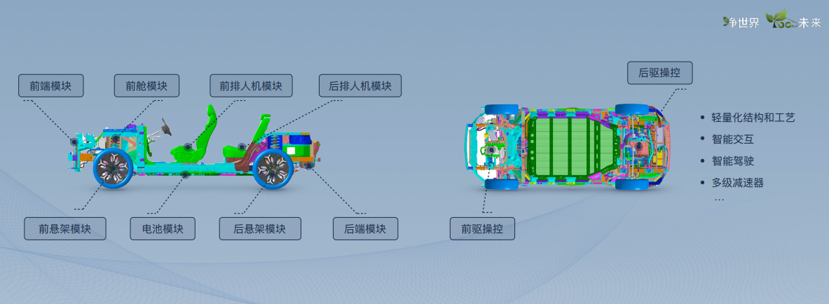 2. 新平台能实现车身模块化,支持轿车、SUV和MPV多种车型设计开发。同时电池也能实现模块化,可以实现不同级别⻋型电池包互换 续航升级(400——700+公里)拓展开发,可实现即换即⽤。