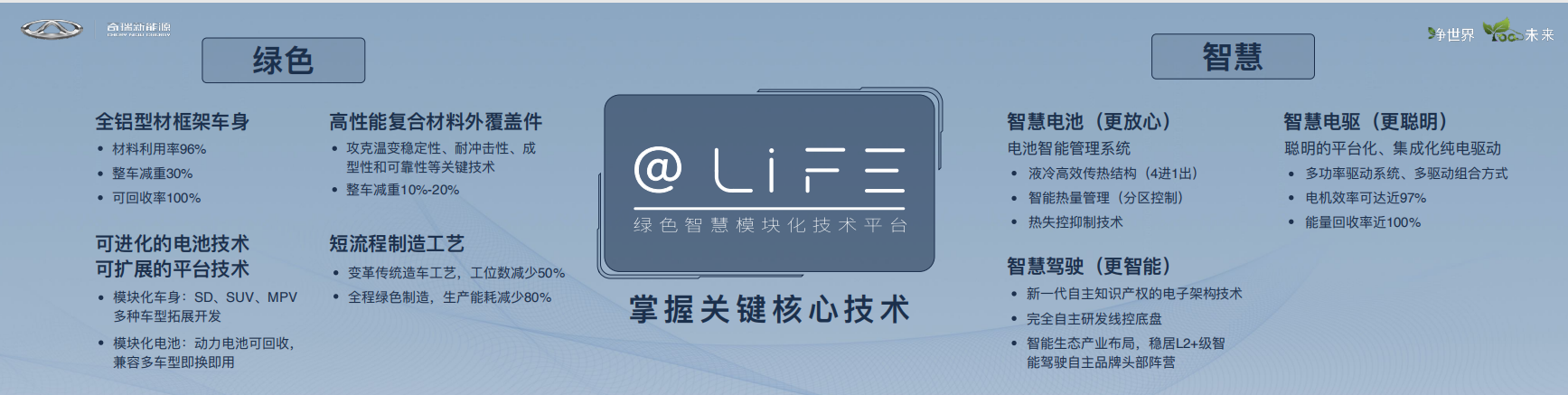 1.@LIFE平台采用全铝车身,能实现整车减重30%,可回收率100%。