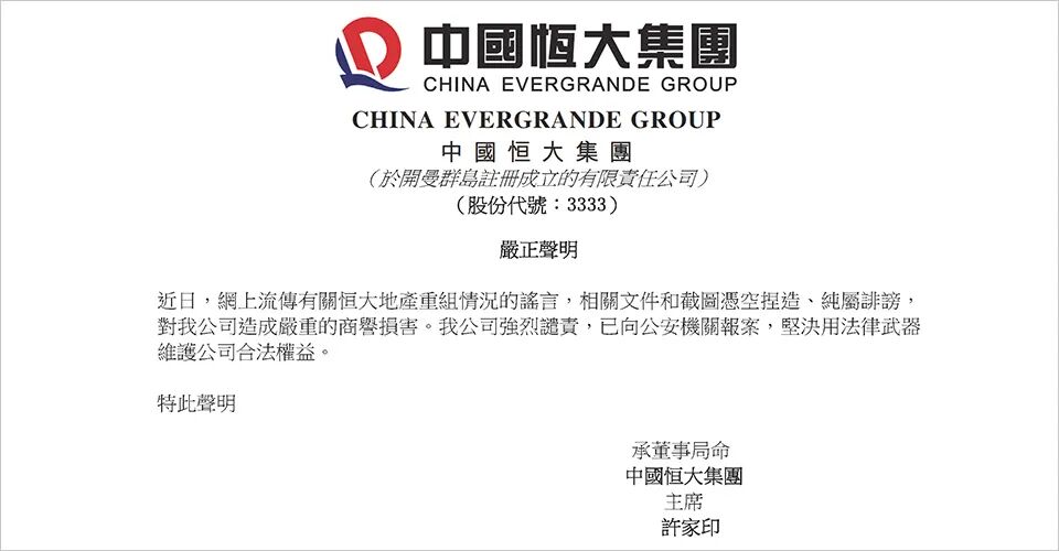 恒大集团发声明辟谣 相关文件和截图凭空捏造、纯属诽谤