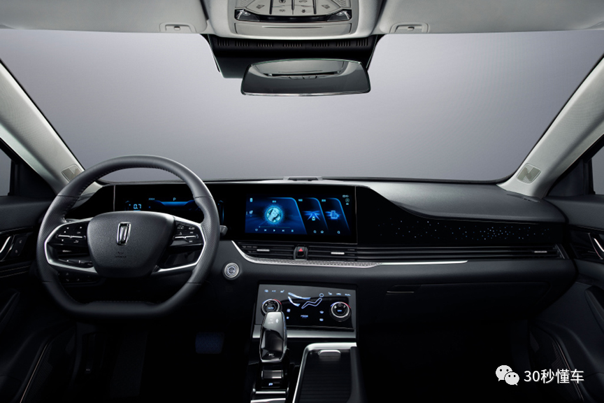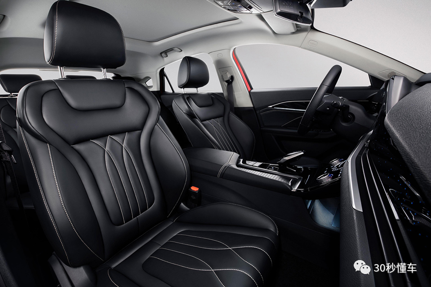 再说内饰,全新第三代奔腾B70的内饰设计运用了时下最流行的设计元素,包括双联悬式大尺寸液晶屏,而且悬浮式面板两侧大幅度向车门处延伸,尤其是右侧车门亮面黑色面板上还印有星点状特殊纹理。换挡杆也是时下流行的电子档杆,为中央通道节省空间的同时,留出一块大小非常可观的储物空间,而且整个中央痛的非常整洁。另外,还有一个颇具赛车风格的平底双幅方向盘,整套内饰充满着科技感。