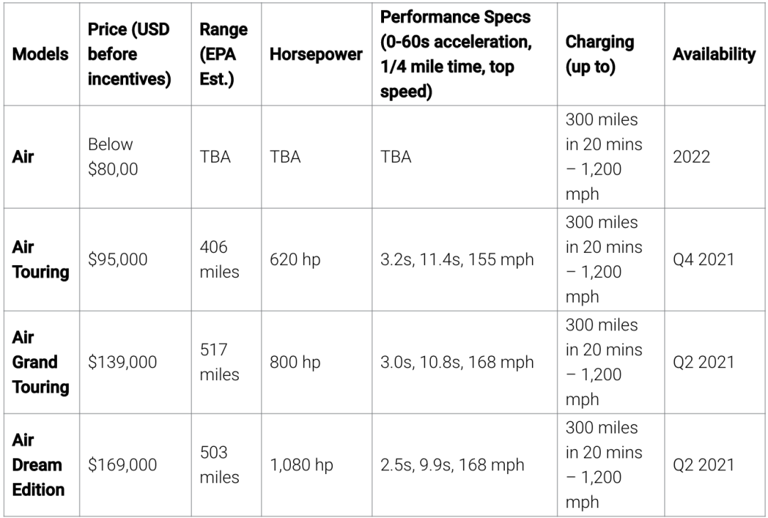 Lucid Air,2020年9月10日量产版正式发布,主要有Air、Air Touring、Air Grand Touring和AIR Dream Edition四个版本,起售价为77400美元,算上税收减免,税后69900美元。