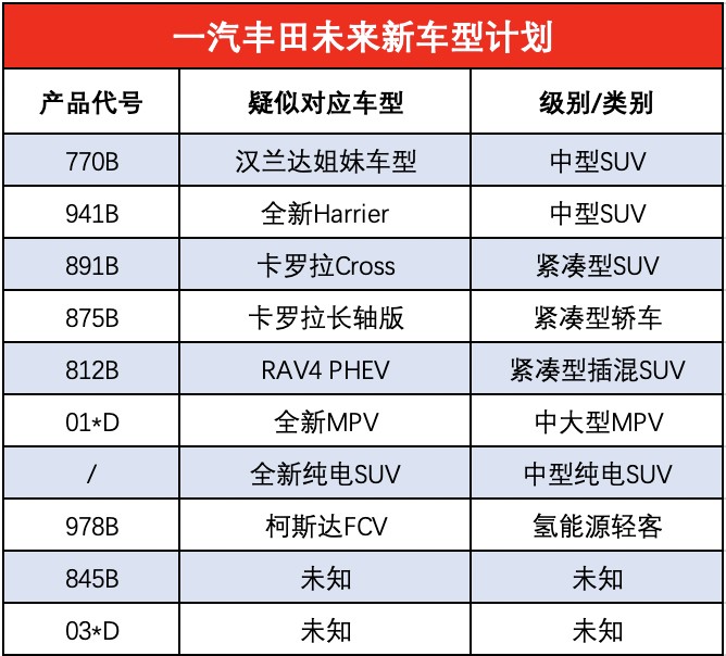 此外,在投产计划中还包括了RAV4 PHEV等新能源车型,毕竟随着国内汽车市场逐渐向电气化时代转变,一汽丰田在新能源领域的布局必须要全面提速。