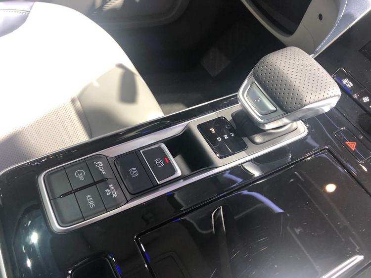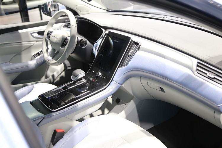荣威R ER6的内饰有宙光和豚跃两种色彩可供选择,宙光主题以黑色为主色调,搭配高端车内独有的蓝色缝线点缀。这台展车为豚跃主题,中控台软包和扶手上应用了蓝珠光皮料。