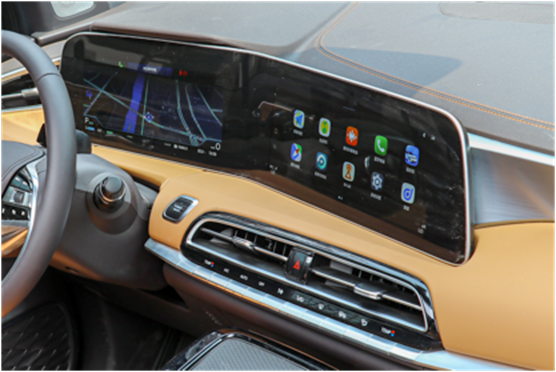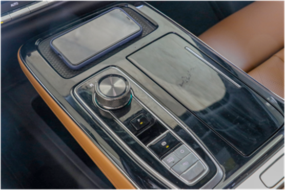 中央采用双12.3英寸高清液晶屏打造,屏幕营造出曲面一体化屏幕,采用冷弯工艺打造,折角近168°,一驾驶员为中心的一种设计体现。不仅如此,中控下方还采用高亮钢琴烤漆装饰板,拥有无线充电等功能,下方采用镂空式设计,提升车内储物能力。