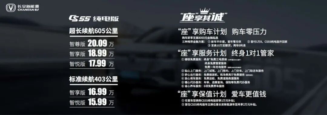 同时,长安新能源还推出了“座”享其“诚”计划,提供三种金融购车方案、多项硬核免费服务、终身管家1对1服务、1万置换补贴等多重服务。