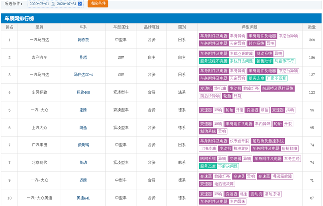 7月汽车投诉排行:马自达阿特兹再夺榜首 标致408又回来了