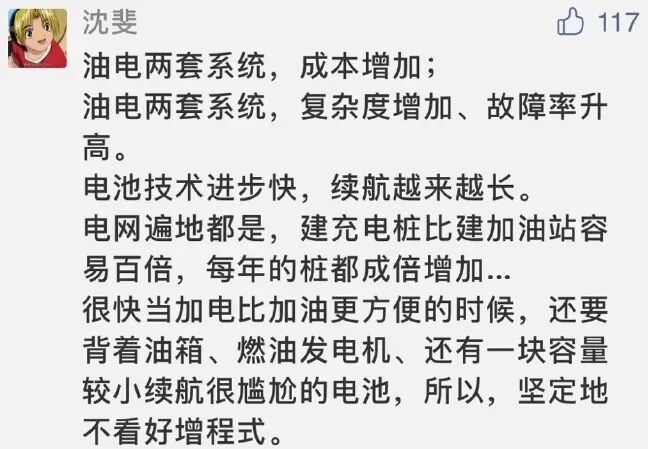 很快当加电比加油更方便的时候,还要背着油箱、燃油发电机、还有一块容量较小续航更尴尬的电池,所以,坚定地不看好增程式。