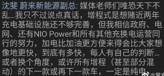 8月7日,知名汽车博主@常岩CY 分享了两张截图,截图内容是蔚来汽车副总裁、能源业务负责人沈斐分享的关于增程式的看法,而增程式恰恰是造车新势力理想汽车此前最大的卖点(现在对外的说法改成了插电式混动,但本质没变)。沈斐表示,坚定地不看好增程式,所有增程(甚至部分混动)的下一款或再下一款车,一定是纯电。