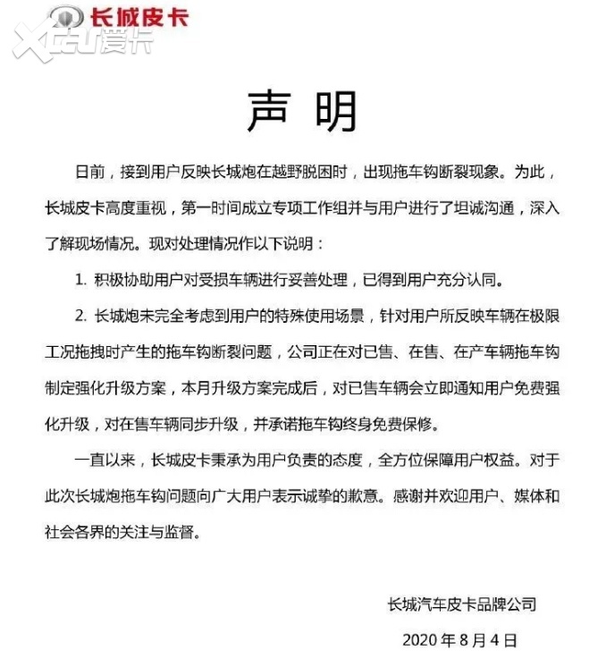 突如其来的事件,引起了消费者和业内人士的强烈关注,而长城皮卡也在第一时间做出了响应,发表声明,并提出解决措施。