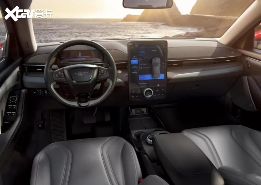 内饰上,Mustang Mach-E采用了比较简约的整体设计,不过位于中控中央的15.5英寸的中控屏尤为引人注目。而全液晶仪表也并非像传统汽车那样镶嵌在仪表台中,而是位于仪表台上主驾驶前方。