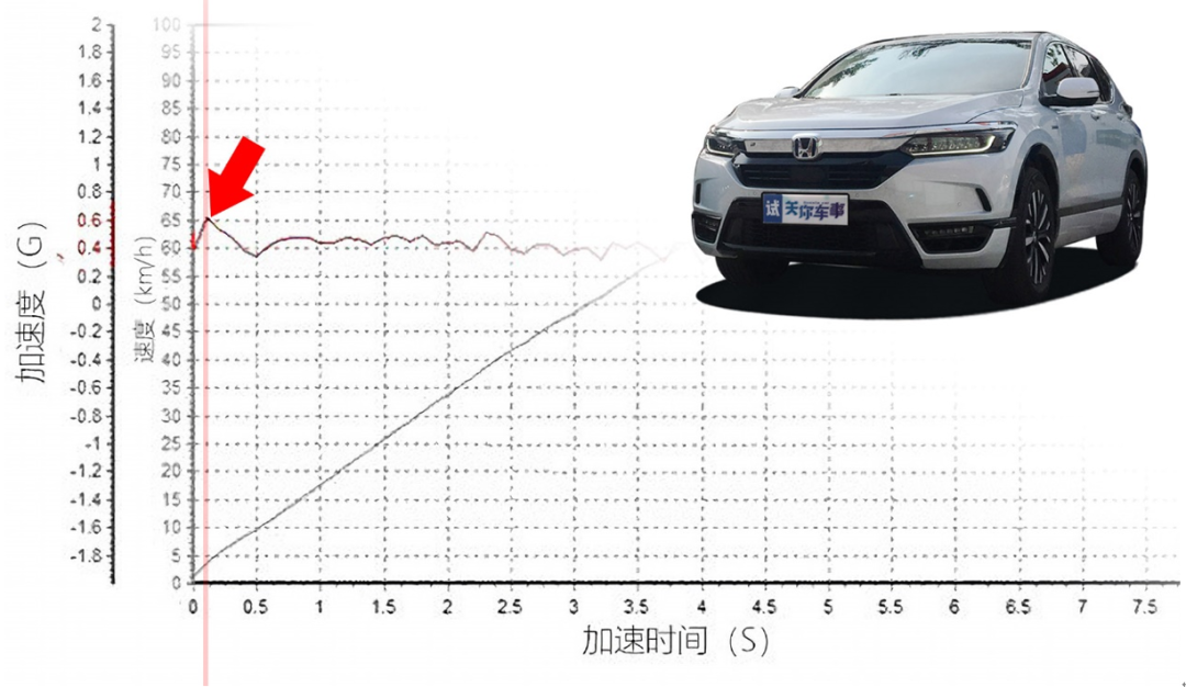 看本田i-MMD混合动力系统,搭载的是135kW/315N•m的大功率大扭矩电机,加速度峰值则出现在0.2秒附近,基本没有延迟,而且加速度峰值能够达到0.6g。随后g值都很平稳,平均g值都大于0.4g,车速上升快而稳。