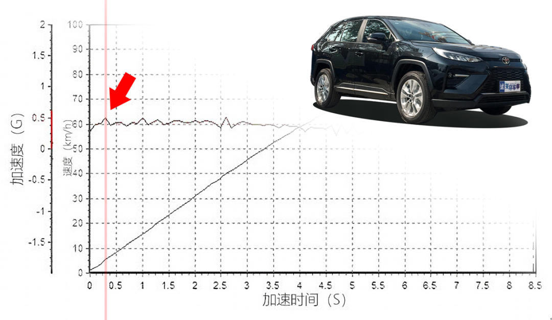 这里我们抛开加速时间,我们只看车辆加速度的曲线。起步阶段,丰田THS II混合动力系统搭载功率和扭矩不算高的电机(88kW/202N•m),加速度峰值出现在0.25秒之后,而加速度峰值接近为0.5g。