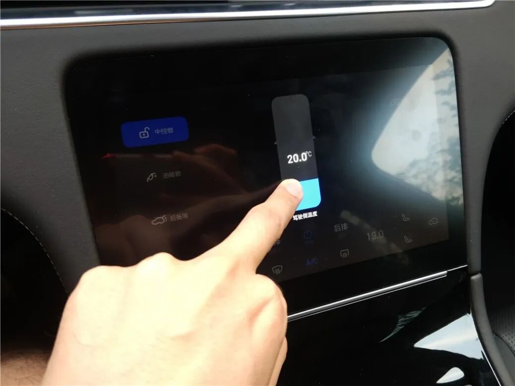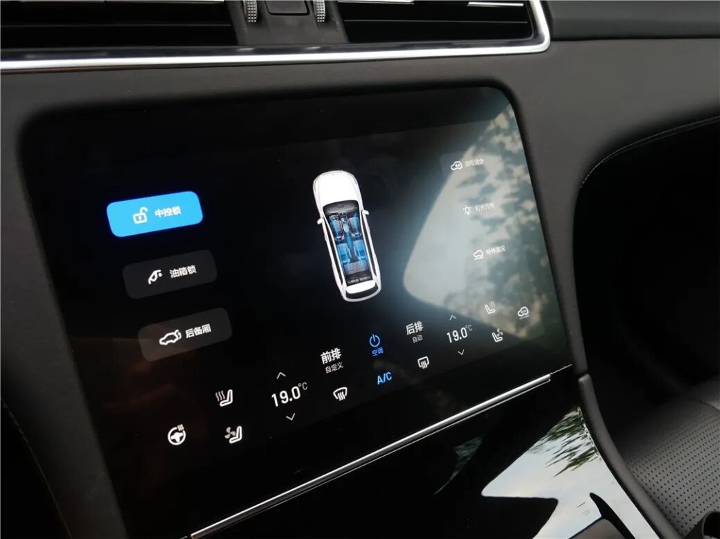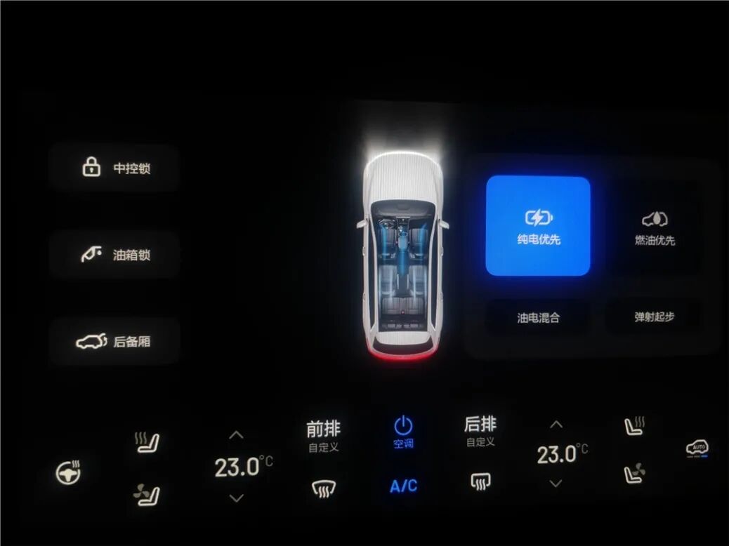 下排中央的屏幕,取代了传统的中控台按键操作区。诸如空调、座椅、门锁、油箱盖、尾厢门、灯光以及混动系统、四驱系统的调节等相对常用的高频操作被放置到了这里。不过乍看之下缺少了风量调节,其实通过手指在屏幕中部的左右、上下滑动,可以快速调节风量和驾驶侧温度,操作虽然方便,但是刚接触的人需要习惯一下。