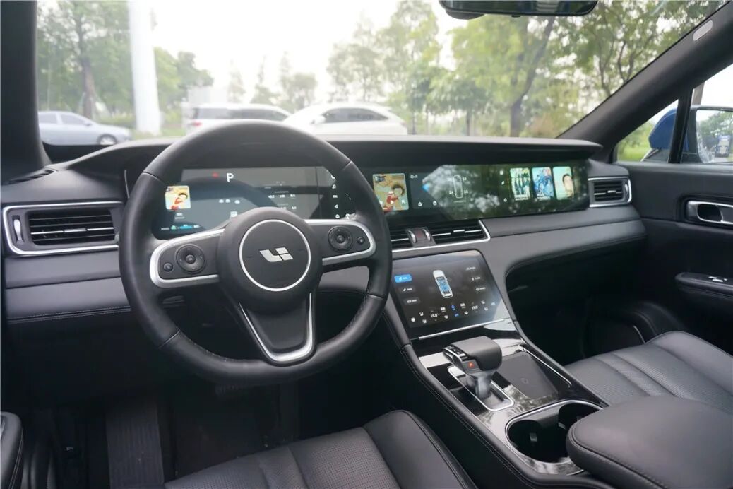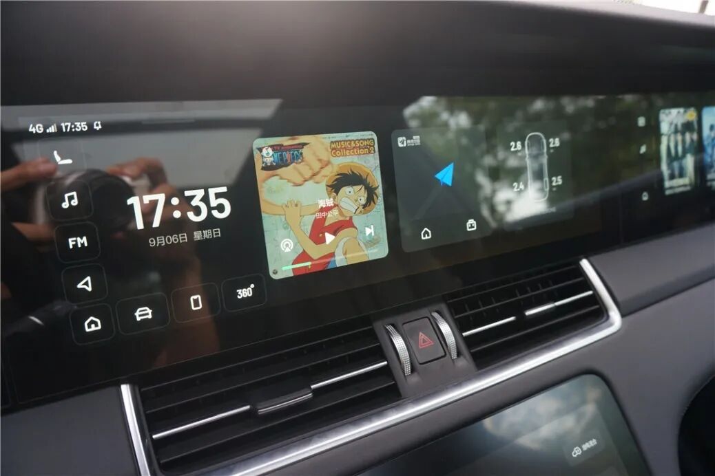 接下来重点看看它的车机系统。四屏交互的设计,似乎看上去有点像拜腾横跨整个中控台的49寸屏,其实中控台上排的三块屏是相互独立的,视觉效果不算抢眼,但相互之间的功能划分很清晰。