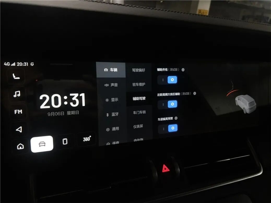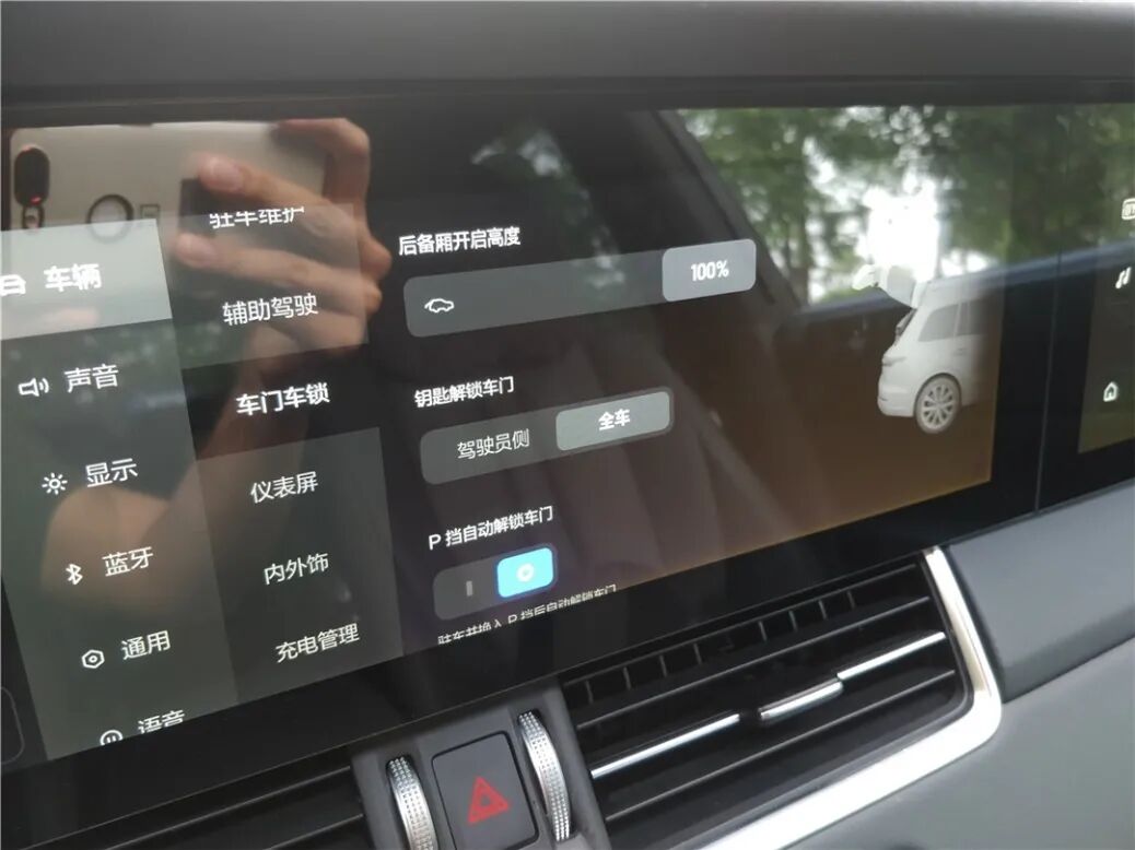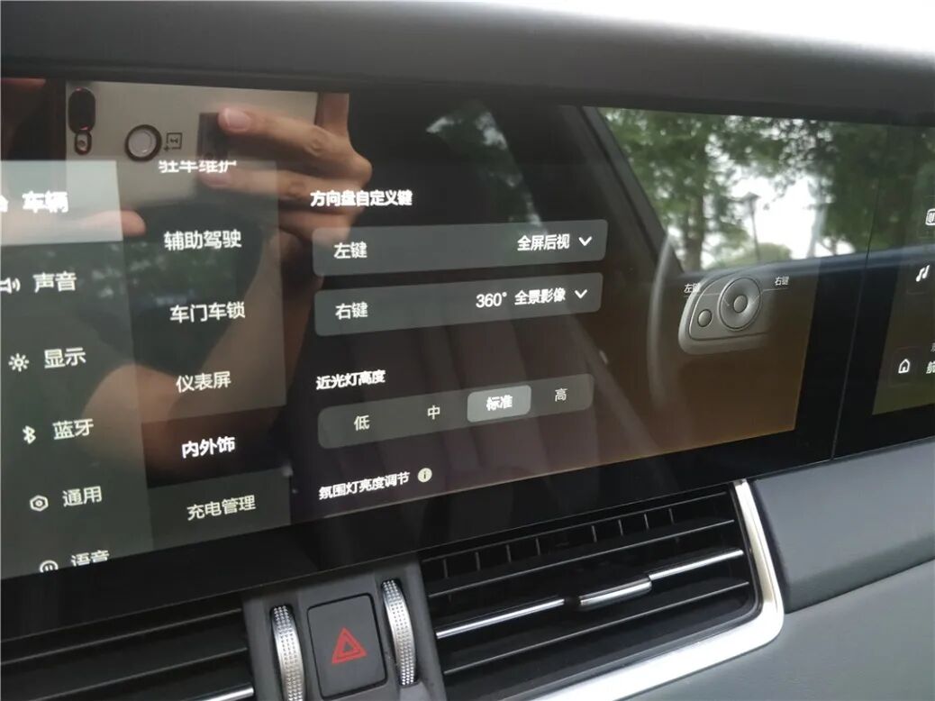除了空调外,关于车辆的几乎所有调节都可以在主屏的“车辆”选项里完成,其中也提供了方向盘按键的自定义、灯光、SOC管理、ADAS参数修改等功能。甚至电动尾门的开启高度也可以在这里调整,这对于不同身高的车主来说非常友好。另外,在低速行驶时周围感应到障碍物的情况下,系统也会自动切入360°环车影像。可以说,系统的基本交互找不到多少缺点。