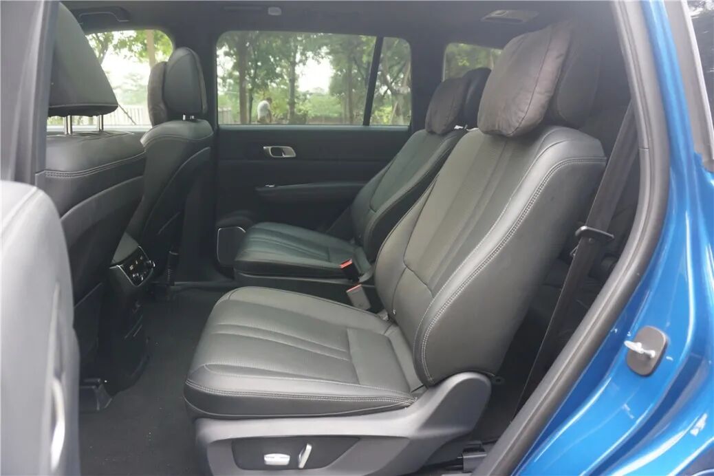 理想ONE提供六座和七座两种设定,这台属于六座版。第二排的两张独立座椅,不但舒适性一流,而且带有电动调节和内侧扶手,中央过道也很宽。巨大的车体,给第二排带来了非常宽敞的纵向调整空间,稍微往前移一点就能给第三排腾出不错的腿部空间。只是第三排地板过高,座椅也偏小,所以一般身材的成年人坐在第三排还是比较难受的。
